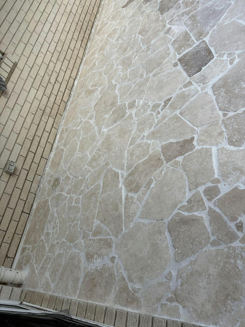 Grouting fills the joints between the stones with mortar — this can be raked back, flush, or even over-grouted depending on the style.